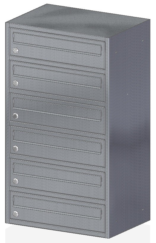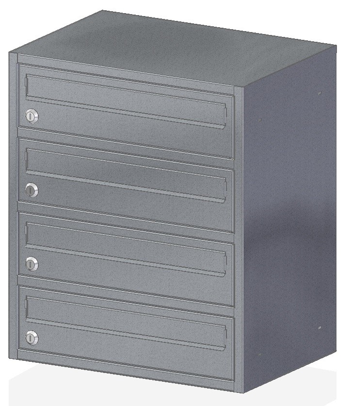Skrzynka nieprzelotowa przeznaczona do montażu na przegrodzie budowlanej, wewnątrz budynków mieszkalnych. Wrzut korespondencji odbywa się dłuższym bokiem przez odchylenie klapki na zewnątrz do góry skrzynki. Drzwiczki otwierają się na bok.